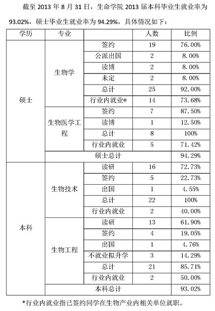 生命学院2013届毕业生就业情况通报