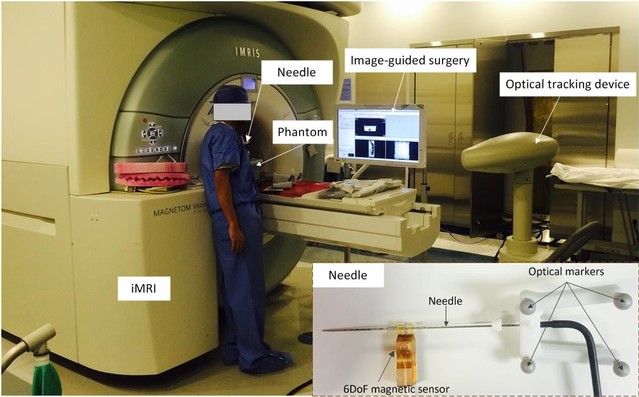 该方法利用MRI软组织对比度高的优势,对软组织病变进行定位。首次采用磁共振兼容的电磁和光学定位传感器,提出基于无迹卡尔曼滤波的传感器信息融合方法,实现探针末端精确实时定位与跟踪,以3D Slicer为平台开发手术导航系统,结合术前和术中影像为医生提供实时手术引导,解决手术操作空间局限性问题,缩短手术时间,提高手术效率。