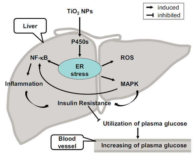 目前针对纳米材料,尤其是纳米二氧化钛(TiO2 NPs)可引起生物毒性机制的广泛观点是TiO2 NPs在生物体内可引起活性氧的大量积累,最终引起机体氧化应激,进而引发一系列损伤和疾病。本研究利用高通量测序技术(RNA-sequencing)对TiO2 NPs引起小鼠血糖代谢紊乱机制进行了研究,发现TiO2 NPs在小鼠体内引起了内质网应激,并且内质网应激起到中心作用。TiO2 NPs在进入小鼠机体内后引发P450s基因参与的外源性生物降解反应,该反应发生在内质网,进而引起内质网功能紊乱,导致内质网应激,内质网应激通过激活MAPK通路与NF-B通路引发的炎症反应,导致小鼠肝脏细胞胰岛素受体底物(IRS1)磷酸化,进而引起小鼠胰岛素抵抗,引发小鼠血糖代谢紊乱。本研究为纳米材料毒理学机制研究提供了新的参考。