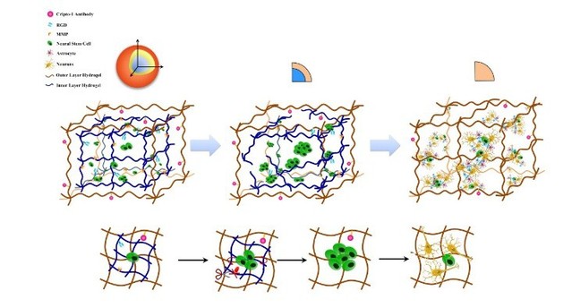 对干细胞移植存在的移植成活率和有效分化率低两大难题哈尔滨工业大学田维明教授课题组设计了双层智能水凝胶系统,内层水凝胶通过接枝RGD以及模拟移植干细胞的力学微环境在移植后的炎症高发期不仅可以阻挡炎症因子的侵入而且可以促进移植的干细胞的增殖,在干细胞增殖的同时,其分泌的MMP可以通过切割接枝在内层特定量的MMP多肽来降解内层水凝胶,通过调节接枝MMP多肽的量,来躲避炎症高发期的损害,同时为了解决有效分化率低,我们将Cripto-1单克隆抗体接枝到外层水凝胶上,并证实Cripto-1抗体的封闭能促进神经干细胞向多巴胺能神经元的定向分化。另外,该系统可以根据移植干细胞的不同以及临床需要调整,简单易行,为干细胞治疗神经退行性疾病提供了新的思路。