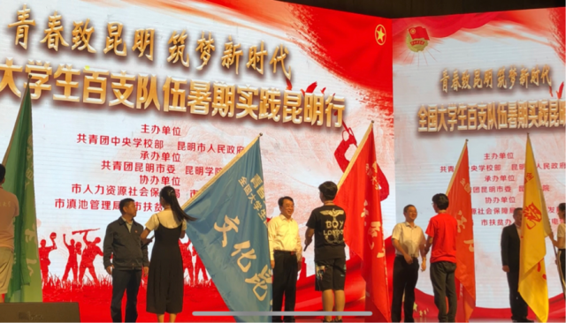 启动仪式中,中共昆明市委副书记刘智同志、共青团中央学校部副部长、全国学联副秘书长宋来同志,共青团云南省委副书记赵攀峰同志,昆明学院党委副书记张祖武同志,团市委书记郝国栋同志分别为哈尔滨工业大学、中国科学技术大学等五所知名高校授旗。