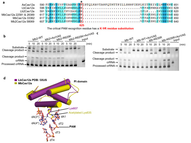 课题组首先通过生物信息学方法寻找到一类anti-Cas12a候选蛋白,再通过生化和细菌实验发现其中的一个anti-Cas12a蛋白AcrVA5具有抑制Moraxella bovoculi (Mb) Cas12a活性的能力。但意外的是,凝胶迁移实验发现AcrVA5蛋白并不结合MbCas12a-crRNA,这个现象与以前研究发现的anti-CRISPR蛋白通过结合Cas蛋白阻止靶向DNA的结合或者阻止Cas蛋白核酸内切酶活性完全不一样。他们推测MbCas12a的抑制活性可能是通过一种未知的酶修饰而实现的。而通过对AcrVA5蛋白序列分析以及实验发现AcrVA5蛋白具有乙酰基转移酶活性,进一步的生化实验证实AcrVA5蛋白通过乙酰转移酶活性使得MbCas12a蛋白失活。
