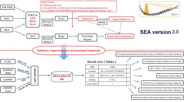 2019年10月31日《Nucleic Acids Research》(IF 11.147)在线发表了生命科学与技术学院张岩教授课题组的新成果《SEA version 3.0:a comprehensive extension and update of the Super-Enhancer》。超级增强子(Super-enhancer,SE)是基因组中大量增强子富集的转录调控区域,能够大幅度地激活基因的表达,且具有较高的组织特异性,在发育、肿瘤等过程中均扮演着重要的角色。为了推动超级增强子相关研究的进展和深入,课题组开发了最新版本的超级增强子数据库SEAv.3.0(http://sea.edbc.org),集超级增强子查询,下载,可视化,分析于一体的综合平台,提供标准查询、基因组浏览器、个性化分析工具和SEs数据下载。数据库存储了11个物种164,545个超级增强子(人,小鼠,果蝇,线虫,斑马鱼,鸡,黑猩猩,恒河猴,绵羊,非洲爪蟾和棘背鱼)以及3,361,785个典型增强子。同时提供超级增强子区域的染色质相互作用、SNPs、转录因子结合位点和SpCas9靶位点的信息。嵌入基于香农熵的工具用于评估SEs细胞类型的特异性。研究人员通过SEA v.3.0的基因组浏览器,可实现基于Hi-C数据的SEs空间交互可视化以及SEs相关基因的在线功能富集分析。张岩教授指出:“超级增强子作为细胞识别基因的重要调控子,其调控机制的深入解析将有助于揭示干细胞多能性、定向分化和癌症重要的调控子。对于具体癌症类型中的超级增强子的识别和深入分析将为个体医疗提供重要的靶标。SEA v. 3.0提供了跨多个物种的所有可用SE信息的全面数据库,并将促进超级增强子的研究,特别是与发育和疾病相关的研究。”