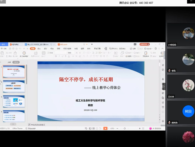 为纪念哈工大建校一百周年,弘扬哈工大“规格严格,功夫到家”的优良传统,结合疫情防控期间学院在线教学取得的成效,学院于2020年5月20日下午14:00通过腾讯会议在线召开了第四届教学节活动——“云端战疫”挑战与发展报告交流会。生命学院院长黄志伟教授、教学副院长聂桓教授、学院大类教学委员会及全体教师参加了会议,本科生院教学研究与质量管理处副处长王广智作为特邀嘉宾出席了会议。