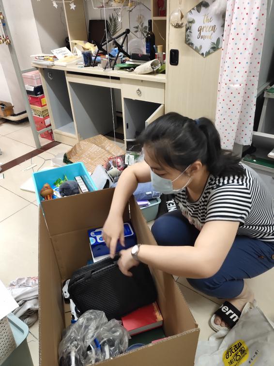 辅导员前期为“打包大军”开线上说明会,讲解整理物资打包流程、注意事项等。其次大家进行现场视频连线,分类整理,归纳成箱并贴好标签。大家连续收拾几个甚至十几个小时,毫无怨言,依旧默默付出,甘心奉献,整理行囊有速度、清空寝室有温度,四年同窗情全部汇聚在点滴行动中。