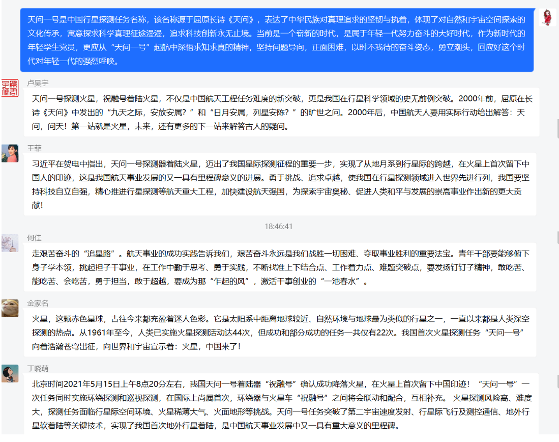 团支部同学熊杨杰:团支部天问一号探测着陆器成功着陆火星,标志着我们在星际探测征程中立下了一块的里程碑。对于国家而言,科技和创新都是最有力的工具,我们要通过这些手段向航天强国不断迈进,为更多的重大工程夯下基础。通过这封贺信,除了生出对参与火星探测任务全体同志的钦佩之情,我更意识到了自己的责任,要在今后的日子里加倍努力,提高自我创新能力科研能力等,为科技强国奉献自己的力量。