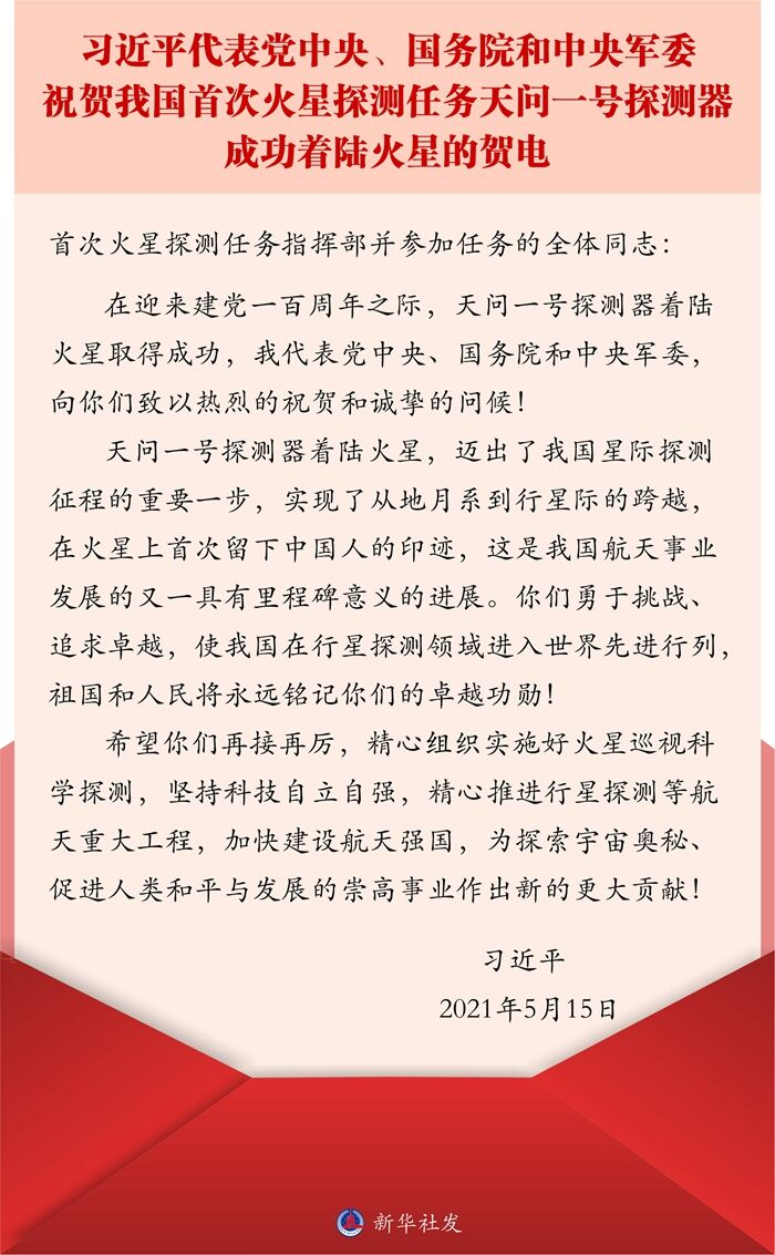 5月15日7时18分,天问一号探测器成功着陆于火星乌托邦平原南部预选着陆区,我国首次火星探测任务取得圆满成功。中共中央总书记、国家主席,中央军委主席习近平致贺电向首次火星探测任务指挥部,以及参加任务的全体同志,致以热烈的祝贺和诚挚的问候。