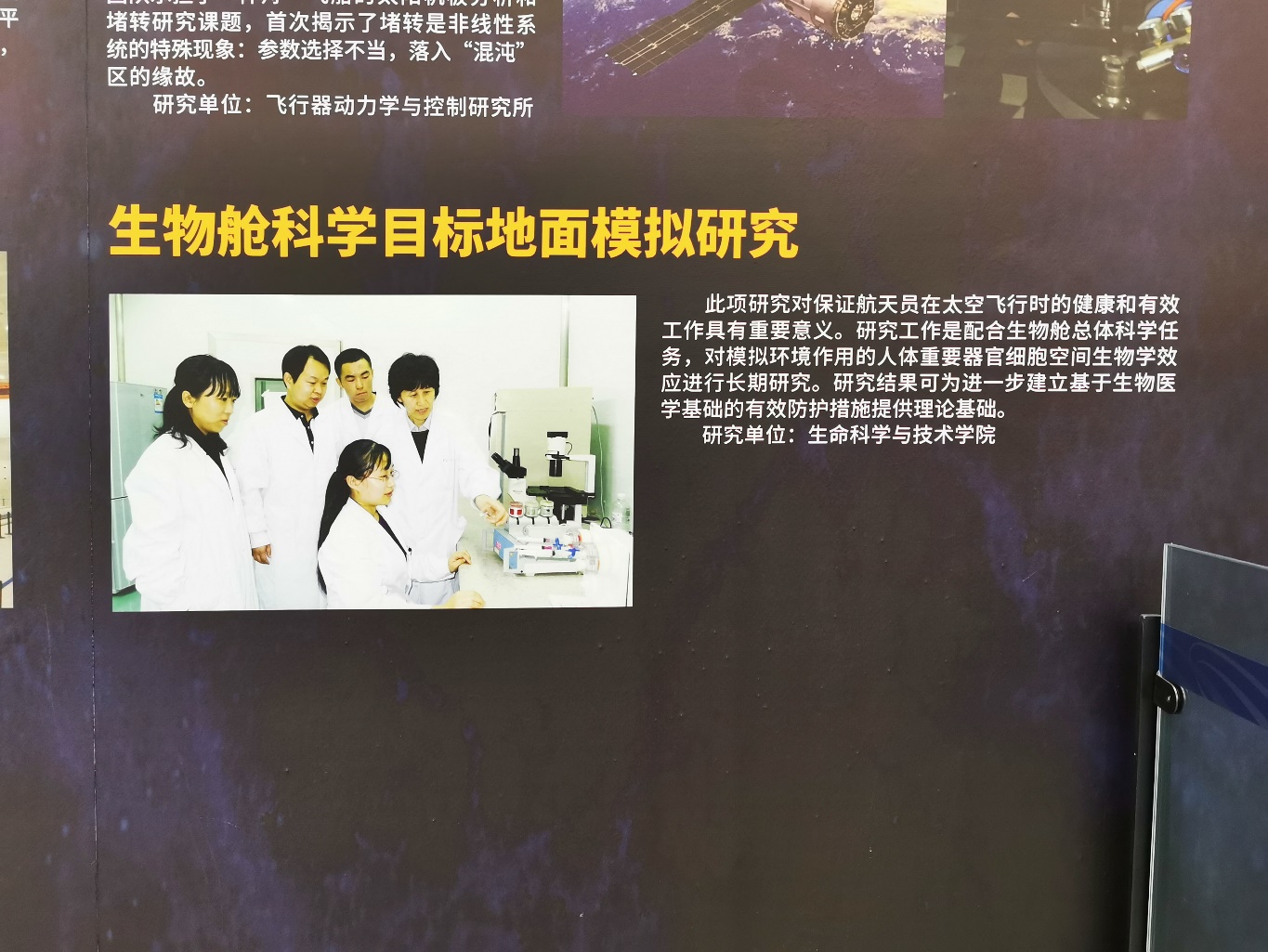 支部党员在两个小时左右的参观过程中,近距离地观察到了中国航天史上的诸多里程碑式进展,空间机械臂亮相天宫二号、“玉兔号”漫步月球、中国天眼“成功开眼”、大科学工程打造地面太空、核心构建助推新型运载火箭、卫星激光通信贯通天地……当在馆内看到生命学院师生们空间生物学和航天医学的相关研究时,党员们更觉得生逢其时,身负重任。空间环境对生命体的影响,对于人类进行长时间探索太空,研究揭示生命的秘密有着重要意义。“生物舱科学目标地面模拟”正是为了配合生物舱总体科学任务,对模拟环境作用的人体重要器官细胞空间生物学效应进行的长期研究,为进一步建立基于生物医学基础的有效防护措施提供了理论基础,保证了航天员在太空飞行时的健康和有效工作。