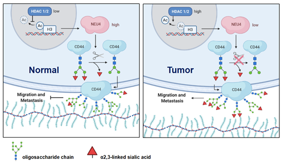 体外细胞实验表明,NEU4过表达能抑制HCC细胞的迁移和侵袭,增强细胞与细胞外基质模型的粘附,并能抑制HCC细胞在裸鼠体内的实验性肺转移。同时该研究发现NEU4的关键活性中心位点NEU4E235,其点突变失活形式NEU4E235A过表达不再能抑制HCC细胞的迁移。进一步研究发现,NEU4能通过水解膜蛋白CD44上α2,3-连接的唾液酸,提升细胞对CD44配体、重要细胞外基质组分透明质酸的结合能力,从而抑制HCC细胞的迁移运动能力。该研究将唾液酸酶对细胞迁移运动能力的影响精确到单个分子的层面,不仅能够从糖生物学的角度增进对NEU4在肝癌中的作用、唾液酸与肿瘤细胞恶型表型特征的关系的认识,更有可能为HCC这种高转移性的恶性肿瘤提供新的治疗靶标。