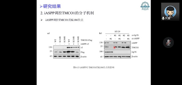 郑善亮详细介绍了癌基因iASPP能够以TMCO1依赖的方式维持低水平内质网Ca2+,并进一步阐述了iASPP调控TMCO1蛋白表达的分子机制,即iASPP(92-294)与TMCO1(90-188)竞争地结合Gp78(301-400),从而增加了TMCO1的稳定性,进而维持内质网中Ca2+稳态,以此促进肿瘤的生长。