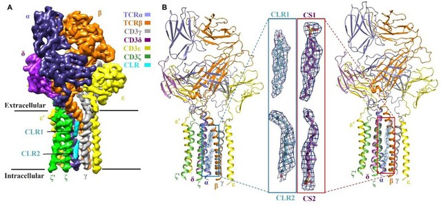 T细胞是脊椎动物适应性免疫的重要细胞,在病毒感染、癌症以及自体免疫疾病中起着关键作用。T细胞通过其TCR-CD3受体复合物特异性识别抗原,将胞外的抗原识别信号跨膜传递到T细胞内,激活胞内的适应性免疫信号通路,启动免疫反应。在2019年,该课题组在《自然》(Nature)上发表了题为“人T细胞受体-共受体复合物组装的结构基础”(Structural basis of assembly of the human TCR-CD3 complex)的研究文章,首次解析了人T细胞受体复合物(包含全部8个亚基)的高分辨率冷冻电镜结构,揭示了TCR-CD3亚基在膜外侧以及膜内识别、组装成功能复合物的分子机制。但一直以来,T细胞受体如何将胞外抗原信号传递到胞内激活T细胞的这一关键机制的结构基础并不清楚。
