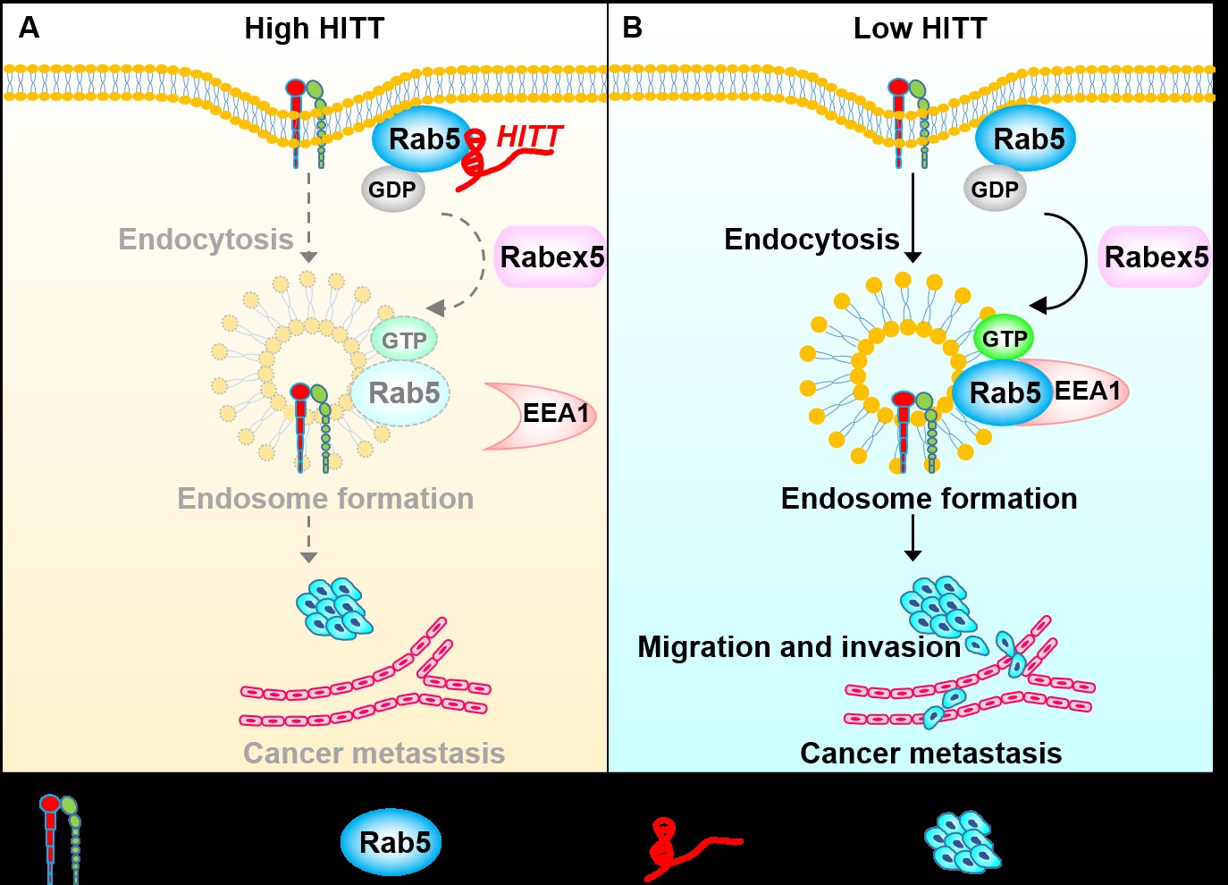 HITT/Rab5通过调控整合素β1的内吞作用抑制肿瘤转移的模式图