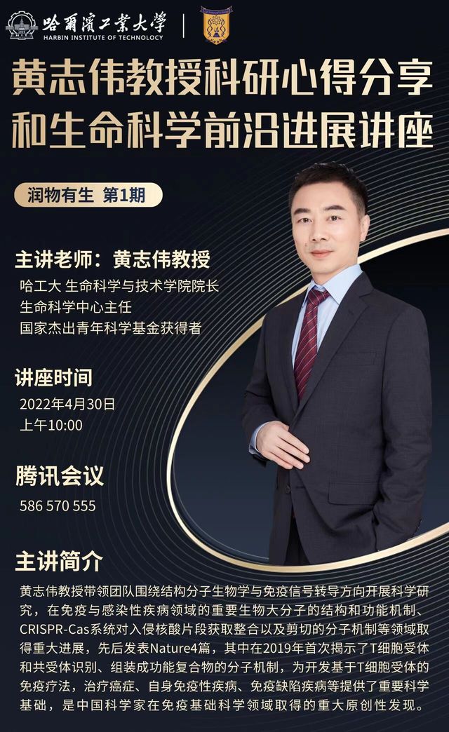 润物有“生”师生交流活动第1期将邀请哈工大生命科学与技术学院教授、院长,生命科学中心主任黄志伟老师,为同学们分享科研心得和生命科学的前沿进展,与同学们进行线上面对面交流。