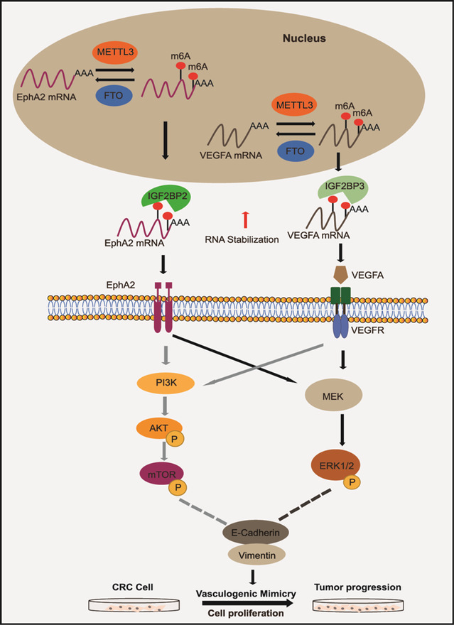 通过TCGA数据库分析发现,在结肠癌中20种m6A相关的调控蛋白中,甲基转移酶METTL3的表达显著上调,在结肠癌组织和细胞中也得到了验证。此外,利用CRISPR/Cas9编辑技术获得METTL3缺失的杂合结肠癌细胞株并进行转录组测序,结果表明EphA2和VEGFA与METTL3呈显著正相关。m6A修饰预测网站以及MeRIP-PCR和荧光素酶报告系统实验阐明了EphA2和VEGFA中富集m6A修饰且EphA2和VEGFA mRNA上m6A motif对EphA2和VEGFA具有调控的作用。从机制上讲,我们发现m6A识别蛋白IGF2BP2识别m6A甲基化的EphA2,而IGF2BP3识别m6A甲基化的VEGFA,以增强EphA2和VEGFA mRNA的稳定性,防止二者降解。RNA-Seq数据分析和体外功能实验表明,METTL3缺失通过阻断HCT-116细胞中的PI3K/AKT和ERK1/2信号通路来抑制结肠癌细胞的增殖、侵袭迁移和血管拟态,并且这种表型和信号通路可以通过恢复靶基因EphA2和VEGFA而得到挽救和激活。随后的异种移植动物模型显示,METTL3缺失抑制了体内肿瘤增殖和存活。这些研究发现表明METTL3依赖m6A修饰调控靶基因EphA2和VEGFA,两种不同的识别蛋白IGF2BP2和IGF2BP3分别识别甲基化的EphA2和VEGFA参与两条信号通路(PI3K/AKT和ERK1/2)来共同促进结肠癌细胞的增殖、侵袭迁移和血管拟态。该工作丰富了m6A修饰的功能性,为理解结肠癌的分子机制提供了新的靶点,也为结肠癌的防治提供了新思路,具有潜在的应用价值。