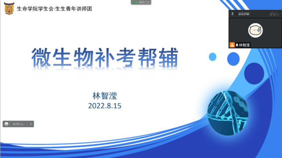 为帮助同学们在暑假期间提高学习效率,合理安排秋季学期补考复习计划,巩固学科专业课程,端正学习态度,2022年8月6日到8月15日,生命科学与技术学院生生青年讲师团通过腾讯会议成功组织了考前帮辅活动,本次考前辅导活动由生生青年讲师团王梓伊老师指导,林智滢同学组织,龚治金、肖贺、田凤仪、林智滢同学担任讲师,对马克思主义基本原理、分子生物学、生物化学和微生物学课程进行讲解