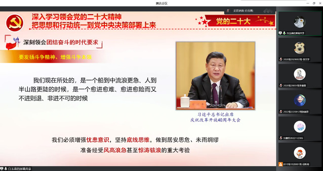 白玉蓉书记从“深入学习领会党的二十大精神,把思想和行动统一到党中央决策部署上来”“深刻把握‘实施科教兴国战略,强化现代化建设人才支撑’的重大战略部署”“以党的二十大精神为引领,勇担时代重任,书写奋斗青春”三个方面带领同学们学习领悟党的二十大报告的精神实质。白玉蓉书记勉励同学们,要认真学习领会党的二十大精神,做到怀抱梦想又脚踏实地,敢想敢为又善作善成,立志做有理想、敢担当、能吃苦、肯奋斗的新时代好青年,为奋力开创哈工大新时代新征程卓越发展新境界团结奋斗、再立新功。