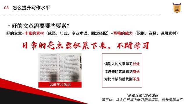 从人民日报中学习新闻撰写,提升撰稿水平。11月26日,生命学院团委组织新闻写作规范培训。张晋玮首先讲解了新闻稿写作规范,以人民日报的几篇文章为例,结合新闻稿写作经验,详细讲解了写作要点、写作提升能力方法、新闻稿自审自查重点。