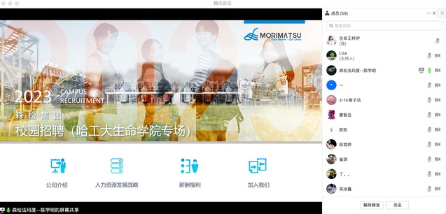 为拓宽毕业生就业渠道,搭建毕业生和用人单位交流平台,帮助学生了解行业发展现状,从容应对当前就业形势,2022年12月29日13:00,生命学院特邀森松生命科技法玛度前端事业部部长陈学明先生、森松生命科技法玛度(中国)事业部副部长由晓迪先生、森松生命科技人事科长赖银琴女士举办专场招聘宣讲。本次宣讲会通过腾讯会议线上进行,2021级、2022级硕士生积极参与,宣讲会由辅导员王梓伊主持。