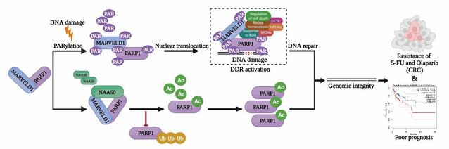 该项研究表明MARVELD1作为DNA损伤响应的介导者扩大DNA损伤响应分子网络并促进维持基因组稳定性;MARVELD1敲除小鼠及其胚胎成纤维细胞具有自发的基因组不稳定性和低水平的PARP1蛋白质稳定性。在机制上,MARVELD1作为PARP1的受体蛋白在第102、118和130位赖氨酸位点发生PARylation修饰,并依赖这一修饰发生应激响应性入核;同时,MARVELD1通过上调PARP1与乙酰化转移酶NAA50的互作强度,促进其乙酰化修饰、抑制泛素化修饰,维持PARP1蛋白质稳定性,与MARVELD1依赖PARP1发生响应性入核形成“反馈环”机制。研究还发现,MARVELD1和PARP1的协同作用导致结直肠癌对基因毒性药物和PARP抑制剂的治疗抵抗,MARVELD1高表达与不良预后相关。此项研究阐明了MARVELD1与PARP1相互作用在调控DNA损伤响应中的重要意义,并为以DNA损伤为切入点的抗肿瘤治疗提供了新的思路。MARVELD1是此课题组首先发现并报道的功能基因,国际上针对MARVELD1分子功能及与肿瘤关系的研究工作主要由此课题组完成。