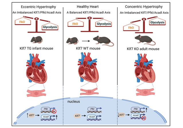 Klf7/Pfkl/Acadl轴调控心肌代谢平衡参与心肌肥厚模式图