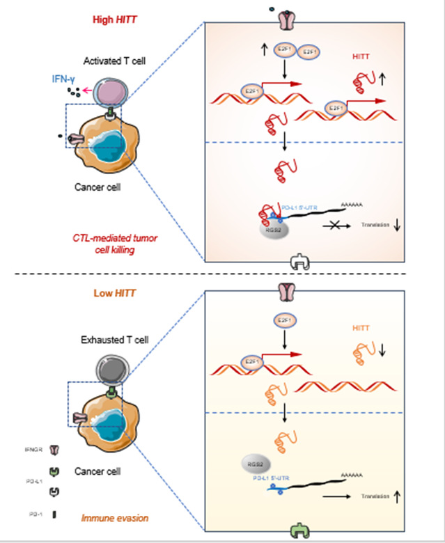 肿瘤细胞内lncRNAHITT抑制PD-L1翻译的机制及其对T细胞免疫的调控作用