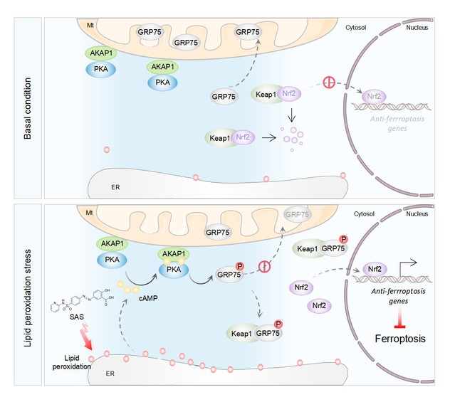 在铁死亡条件下,脂质过氧化主要积聚在内质网,以cAMP依赖性的方式激活蛋白激酶A (PKA)。早期的研究发现,线粒体外膜蛋白激酶A锚定蛋白1 (AKAP1)可将PKA锚定在线粒体外膜上,在局域内发挥其激酶功能。在铁死亡情况下AKAP1锚定的PKA特异性的在MAMs局域磷酸化GRP75的S148位点。这导致GRP75被隔离在线粒体外,并在局部的细胞微域内通过其保守的高亲和力RGD-结合基序ETGE与Nrf2竞争性结合Keap1(细胞内Nrf2的主要抑制因子)。Nrf2随后被稳定和激活,进入细胞核导致一系列抗铁死亡基因的转录。多种体内外模型的研究发现,AKAP1/PKA/GRP75信号轴对结直肠癌的铁死亡敏感性具有重要调控作用。