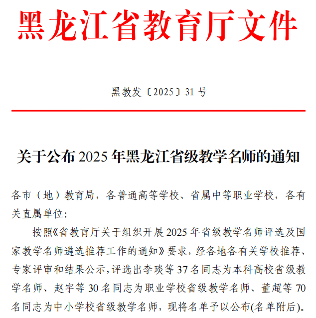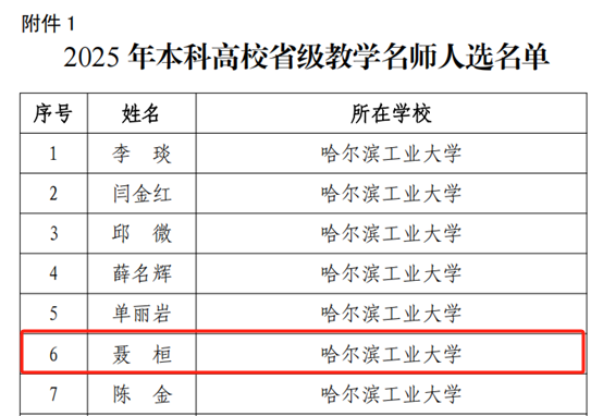 近日,黑龙江省教育厅公布2025年黑龙江省级教学名师结果,其中我院教师聂桓教授榜上有名。