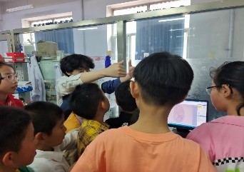 在癌生物学实验室,志愿者讲解了小鼠作为肿瘤疾病模型的优势,并带领同学们在显微镜下观察肿瘤细胞。在空间生物学实验室, 志愿者利用装置讲解了如何利用地面装置模拟微重力环境进行科学研究。 在生物大分子实验室,志愿者利用模型讲解了大分子的结构、应用以及如何人工合成和改造大分子进行研究。