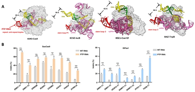 由于在几种用于基因编辑的Cas和TnpB系统中,PTP RNA保守存在(图2A),团队猜想在细胞基因编辑应用中,该研究发现的PTP RNA的磷酸骨架是否会被细胞内某些正电荷蛋白非特异性结合,从而抑制DNA底物结合,最终抑制Cas和TnpB蛋白的基因编辑活性?若该猜想成立,通过去除PTP RNA、解除未知蛋白的抑制,可提高上述系统在细胞内的基因编辑活性。