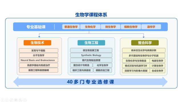 生物技术专业课程设置重点突出基础性和前沿性,生物工程专业课程设置重点突出创新性和实用性,整合科学专业课程设置重点突出基于生命科学的学科交叉融合。